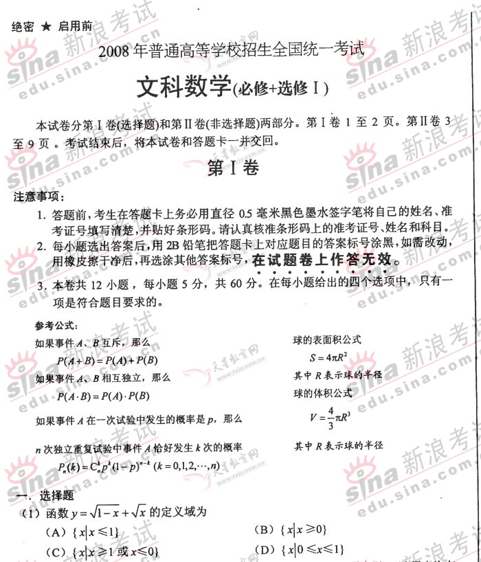 2008年高等學(xué)校全國統(tǒng)一考試數(shù)學(xué)文試題(全國I卷)