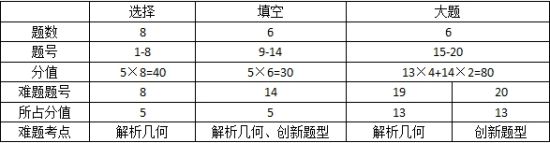 2012年北京高考延續(xù)8+6+6的試卷結(jié)構(gòu),即8道選擇、6道填空、6道大題的形式,所占分值分別為40分、30分、80分。試卷由容易題、中等難度題、難題組成,并以中等難度題為主,總體難度適當(dāng)。在此,有必要為高考試卷做一個(gè)簡(jiǎn)單的分析,如下表: