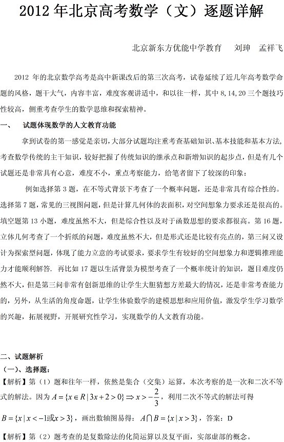 2012北京高考數(shù)學(xué)文科試題詳解 考生估分必看