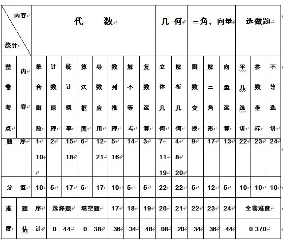 李紅慶老師列出數(shù)學(xué)理科試卷考點(diǎn)內(nèi)容統(tǒng)計(jì)難度評估表