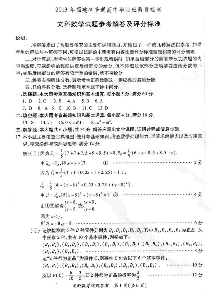 2013年福建高考省質(zhì)檢文數(shù)試題及答案