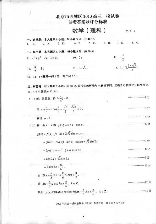 2013年西城一模(理科)數(shù)學(xué)試題及答案(6)