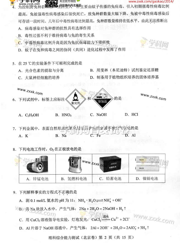 2014年高考北京卷理科綜合試題及答案解析(清晰圖片版)(2)