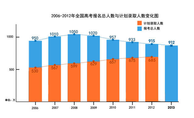 2013年,全國報考人數(shù)為912萬,計劃錄取率比去年也不會有大的變化。