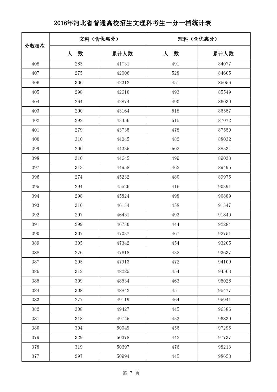 2016年河北高考文理科考生一分一檔統(tǒng)計(jì)表(7)