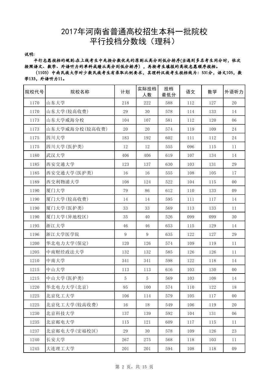 河南高考本科一批院校平行投檔分?jǐn)?shù)線(理科)(2)