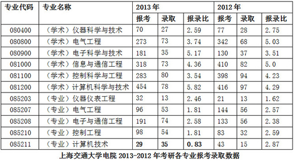 上述表格數(shù)據(jù)是上交大電院2013年和2012年的報(bào)考錄取數(shù)據(jù)(2014年尚未公布)?偟恼f(shuō)來(lái),上交大電院學(xué)碩比專(zhuān)碩的報(bào)錄比高出不少,其中電子信息科學(xué)與技術(shù)和計(jì)算機(jī)科學(xué)與技術(shù)及儀器儀表工程(專(zhuān)碩)這三個(gè)專(zhuān)業(yè)呈上漲趨勢(shì)。這就意味著競(jìng)爭(zhēng)更加激烈。