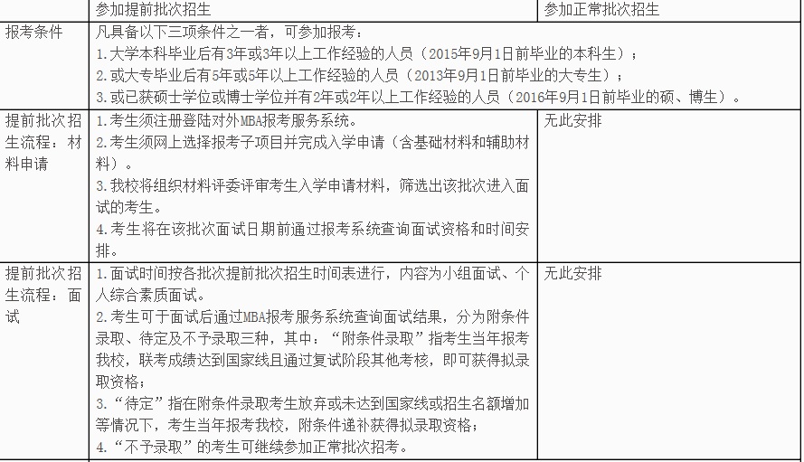 4. “MBA提前批次招生”將安排于2017年5月至11月進行,參加提前批次招生的考生需在聯(lián)考報名前的指定期間內(nèi)在線提交申請材料,經(jīng)過材料評審,擇優(yōu)給予面試資格;經(jīng)過面試給予綜合素質(zhì)優(yōu)秀的考生“附條件錄取”資格;原則上,該類考生參加全國聯(lián)考成績達到國家A線即可錄取。