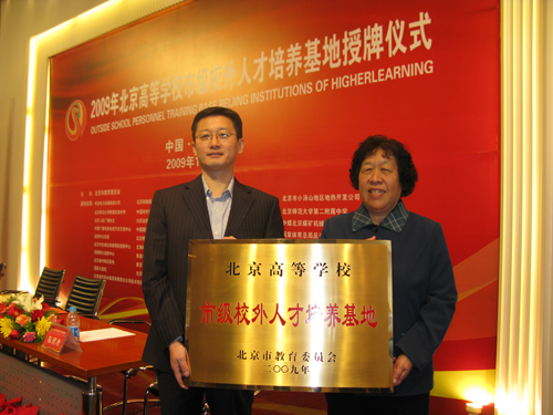 11月19日,北京市教委隆重舉行2009年北京高等學(xué)校市級(jí)校外人才培養(yǎng)基地授牌儀式,北京市教委主任劉利民、教育部高教司司長(zhǎng)張大良、實(shí)驗(yàn)室處處長(zhǎng)孫麗為、北京市教委副主任郭廣生等出席授牌儀式。北京城市學(xué)院教務(wù)長(zhǎng)成運(yùn)花、共建單位交通銀行培訓(xùn)中心總經(jīng)理郭偉應(yīng)邀參加了授牌大會(huì)。