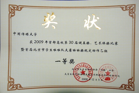 中國(guó)傳媒大學(xué)健美操隊(duì)的女孩們?cè)趫?chǎng)邊屏住呼吸,焦急的等待著比賽結(jié)果的公布!2009年首都高校第30屆健美操、藝術(shù)體操比賽暨首屆北京市學(xué)生啦啦操比賽乙組規(guī)定動(dòng)作冠軍是——中國(guó)傳媒大學(xué)!”話音剛落,健美操隊(duì)的女孩們就歡呼了起來,眼里溢滿喜悅的淚水。