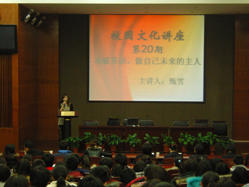 講座中,甄雪講解了英語學習的重要性,與同學們分享了學習心得及個人的成長經(jīng)歷,并就大學的學習、生活及未來的職業(yè)規(guī)劃給同學們提出了有益的建議。此外,ABC教育集團的老師針對09年英語四六級考試命題方向、解題技巧及高分秘訣進行了分析和解讀。她們以新穎的形式與同學們進行現(xiàn)場互動,她們妙趣橫生的語言引發(fā)了陣陣笑聲與掌聲,使同學們都受益匪淺。