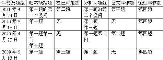 如該表所示,歸納概括題依然是每年必考的題型,對這類題考生一定要把材料吃透,從全面、準(zhǔn)確、簡潔、有層次四個方面進(jìn)行解題。不過其中值得指出的是,現(xiàn)在的歸納概括和分析問題題有融合的趨勢。出題的模式一般是,在第一題設(shè)置兩個問題第一個問題是典型的歸納概括題目,第二個問題一般需要在前面歸納出來的問題上進(jìn)行必要的分析。
