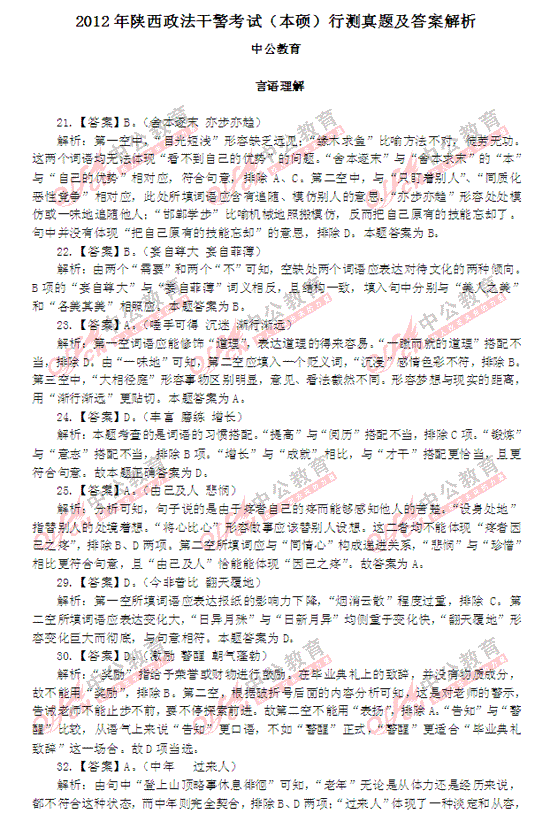 2012陜西政法干警(本碩)行測(cè)言語(yǔ)理解答案解析