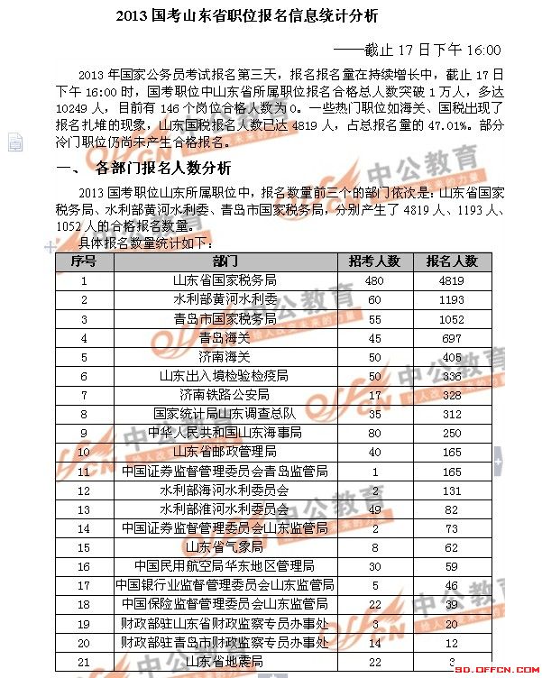 2013國考山東職位報名信息統(tǒng)計分析(截止17日)