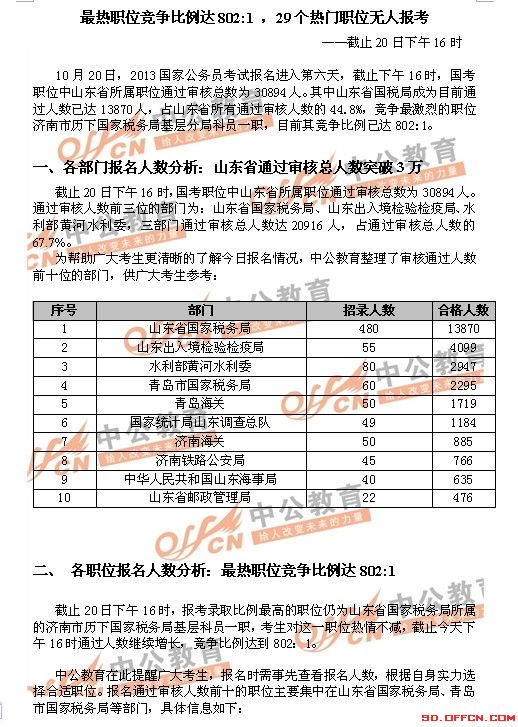 2013山東省國家公務員報名人數(shù)分析(20日)