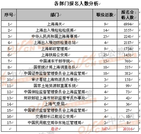 一、各部門報名人數(shù)分析:截止20日下午16時,通過審核人數(shù)前三位的部門依次是:上海海關(guān)、上海出入境檢驗檢疫局、中華人民共和國上海海事局,三部門通過審核總?cè)藬?shù)過萬,達(dá)12792人,占通過審核總?cè)藬?shù)的62.97%.交通部長江航運(yùn)監(jiān)督局、上海海事局、上海鐵路公安局、上海氣象局、中國證券監(jiān)督管理委員會上海監(jiān)管局、中國保險監(jiān)督管理委員會上海監(jiān)管局都有報名為0的職位。這些職位報名為0的原因主要是要求工作經(jīng)驗或要求是“三支一扶”、“大學(xué)生村官”等條件。