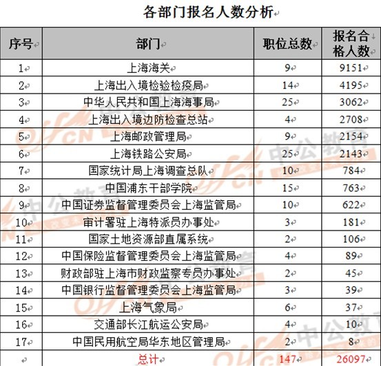 報名為0的職位共有6個,其中上海海事局2個(要求“三支一扶”、“大學生村官”等條件),交通部長江航運監(jiān)督局(要求上海市戶籍、男性)、上海鐵路公安局(要求“三支一扶”、“大學生村官”)、上海氣象局、中國保險監(jiān)督管理委員會上海監(jiān)管局(要求相關工作經驗)各有1個。