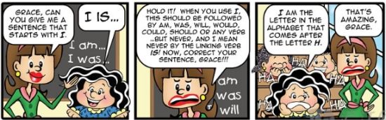 其實Grace以為老師說的是26個字母中的“I”,因為字母“I”如果作主語(這時I看作是第三人稱),謂語就要用is;