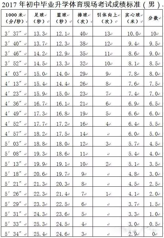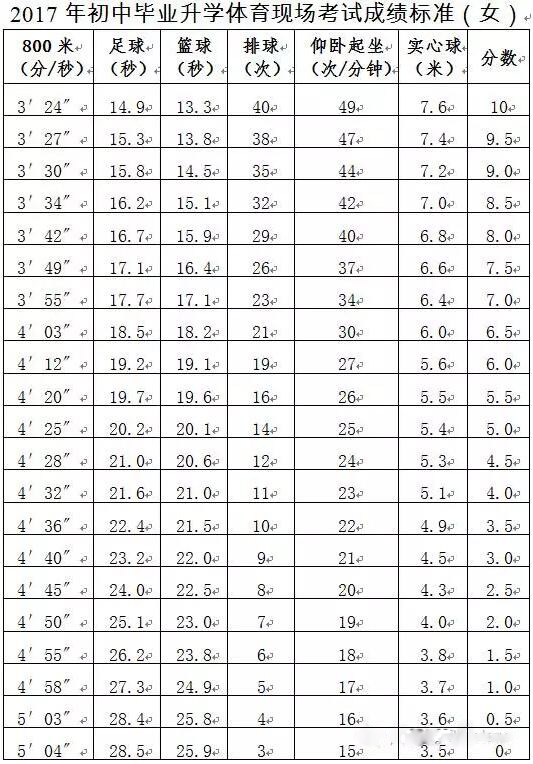 附:2017年初中畢業(yè)升學(xué)體育現(xiàn)場(chǎng)考試成績(jī)標(biāo)準(zhǔn):